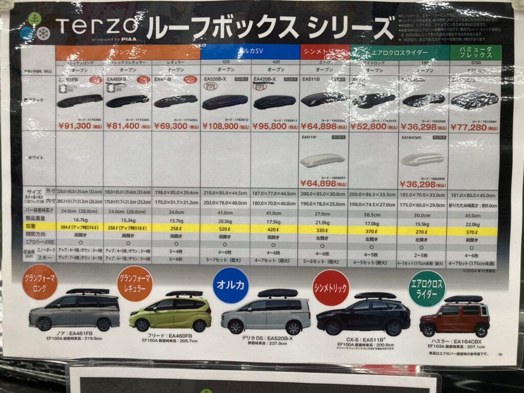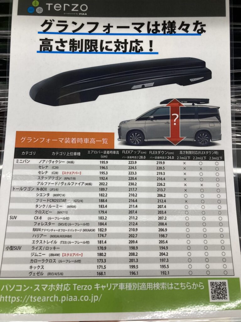 そして、Terzoはベースキャリアバーを含んだ全高を抑えた「グランフォーマ」シリーズというものを出していて、このシリーズであれば、SOLIOのルーフから40cm以内の高さでボックスを取り付けることが可能のようでした。また、THULEの「Motion3 LOWタイプ」もそれに近い薄型のシリーズで、多分このシリーズも可能です。