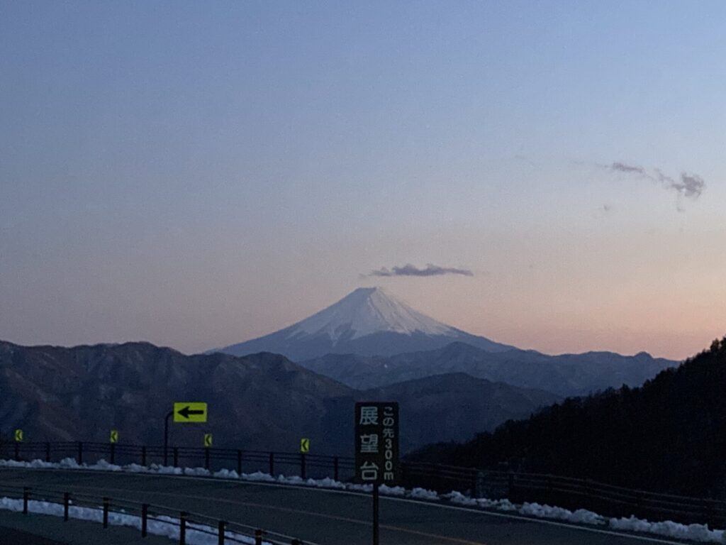 峠を越えたあとのこの道の見晴しは、とても良いです。なかなかお目にかかれない北東からの裏富士を望むことができます。夕闇迫るいい時間帯です。