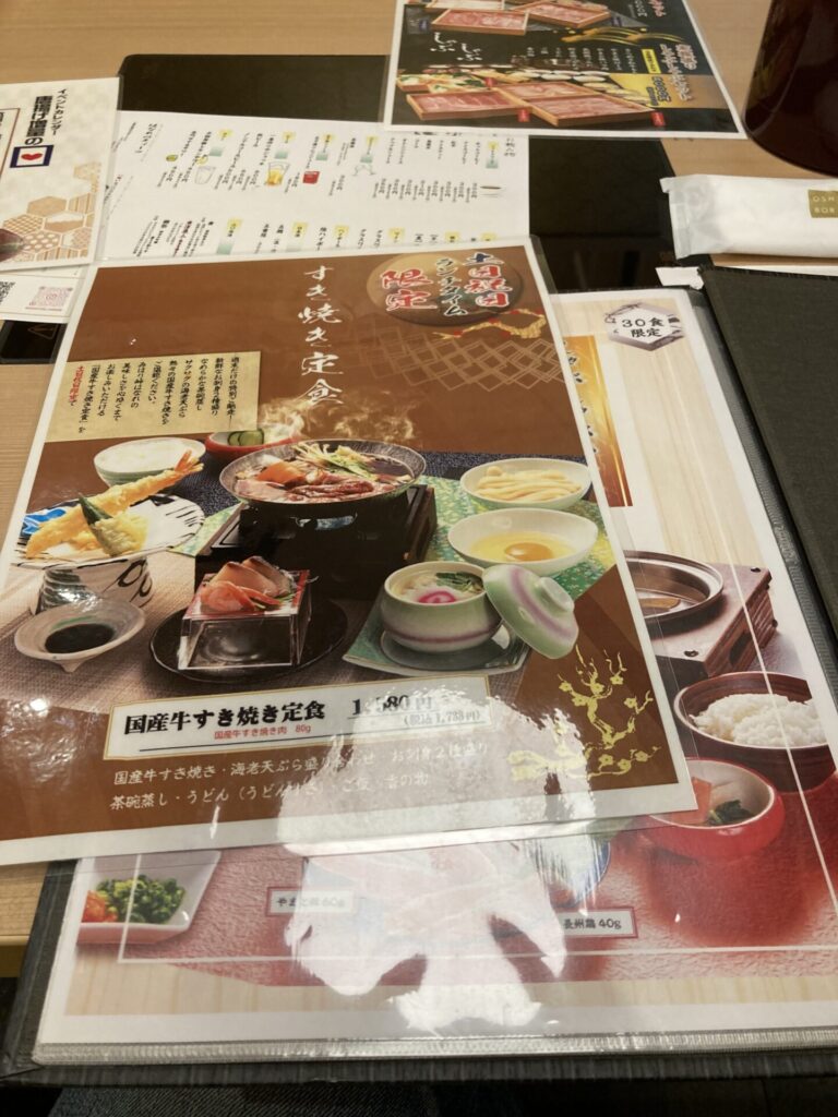 メニューは、すき焼き定食やステーキ重、和定食など肉料理を中心に構成され、ボリュームと味のバランスが良いことで知られています。昼時はランチ利用、夜は会食や家族連れにも対応できる構成になっています。もちろんお目当ての「やまぐち和牛 燦(きらめき)」が食べれます。